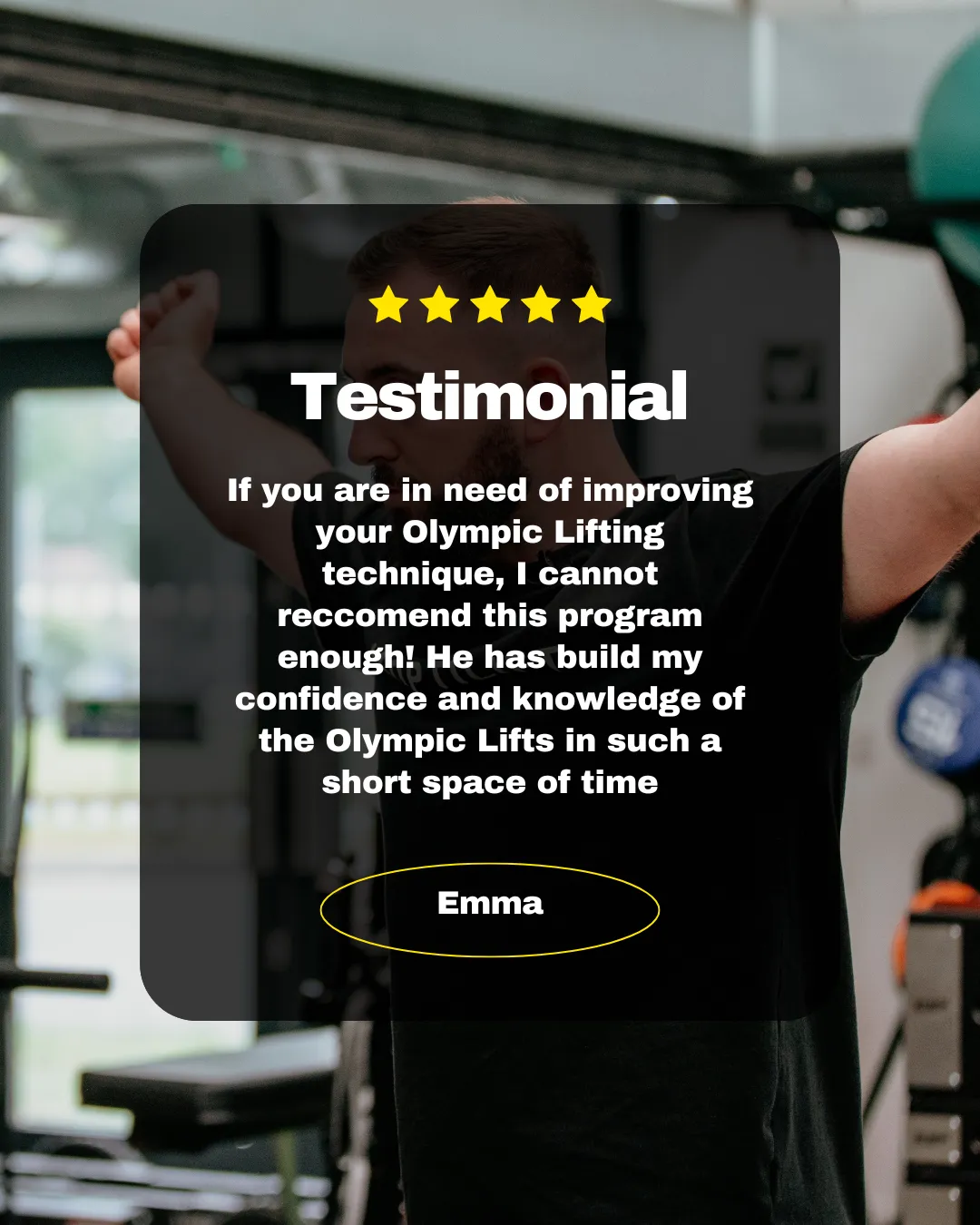 Instead of watching random videos and listening to hundreds of coaches contradict one another, this program gives you a structured progression, mobility fixes, and proven coaching cues that prevent bad habits. This has been created to improve clarity of how to successfully perform the Olympic Lifts